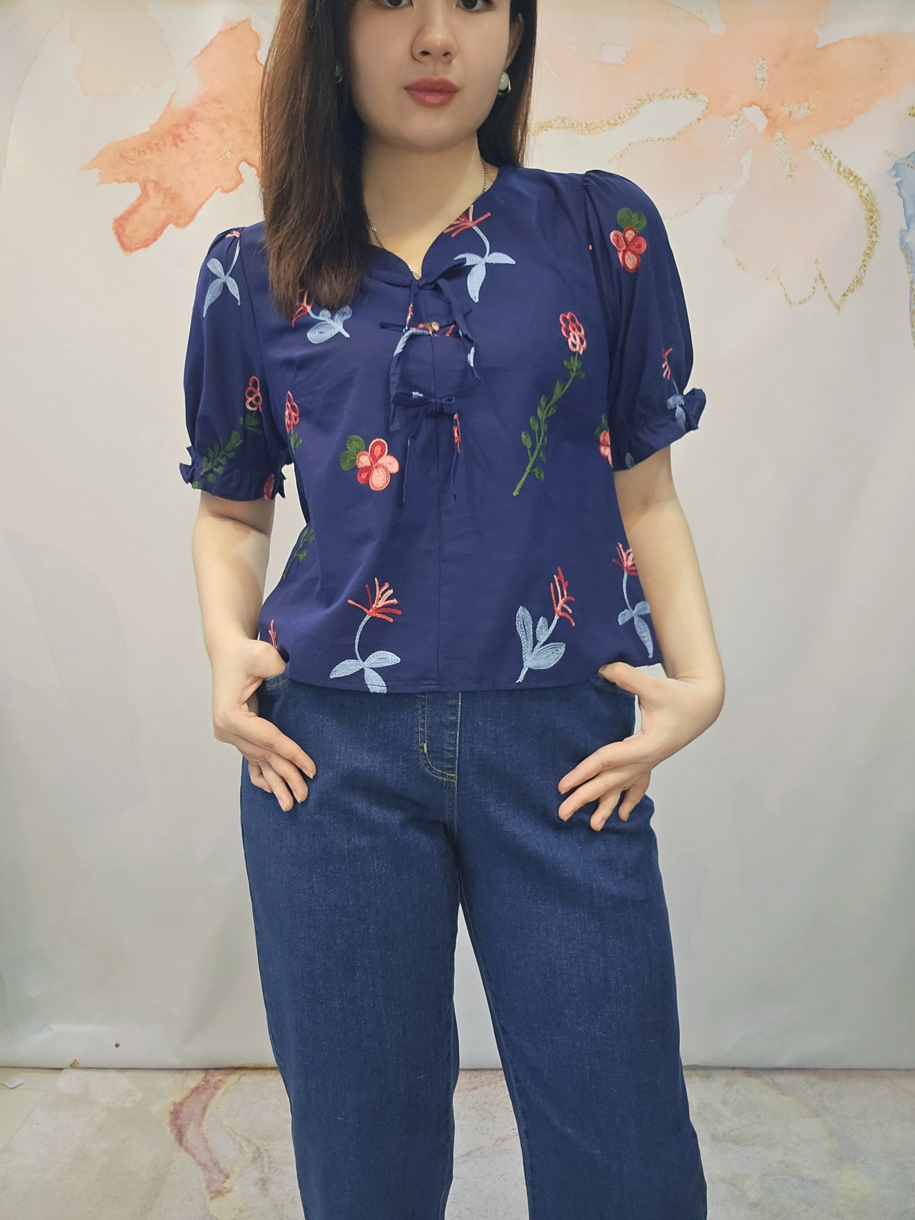 EBF9658 Chinese Style Flowy Chiffon Mixed Mulberry Silky Floral Top
